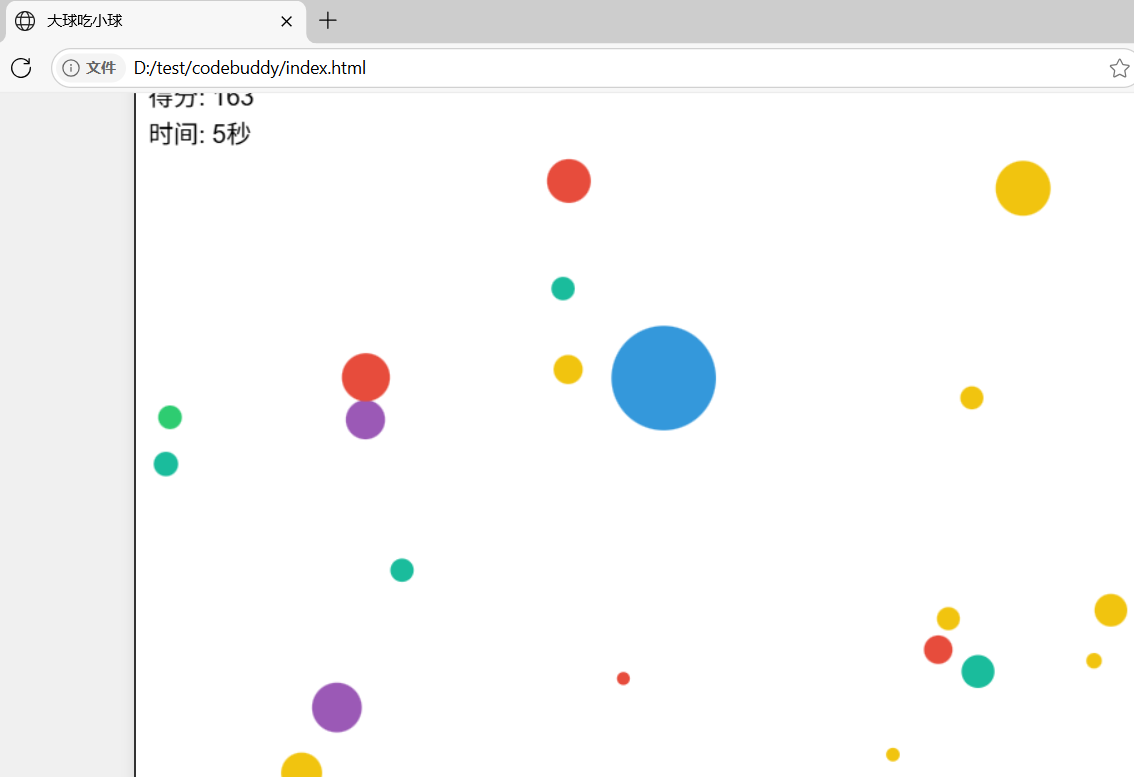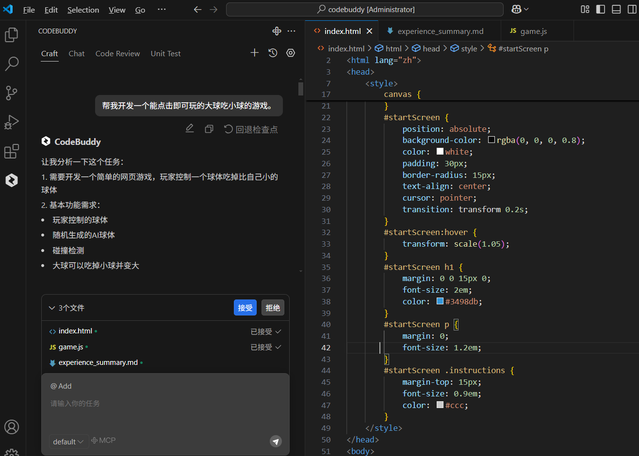 一直听说CodeBuddy对话式编程能力强,这次我打算试试看。本次项目是一个基于HTML5 Canvas的"大球吃小球"网页游戏。通过这个项目,我深入体验了CodeBuddy的Craft智能体在实际开发中的表现,特别是其在游戏开发这种需要多文件协同、复杂逻辑处理的场景下的能力。