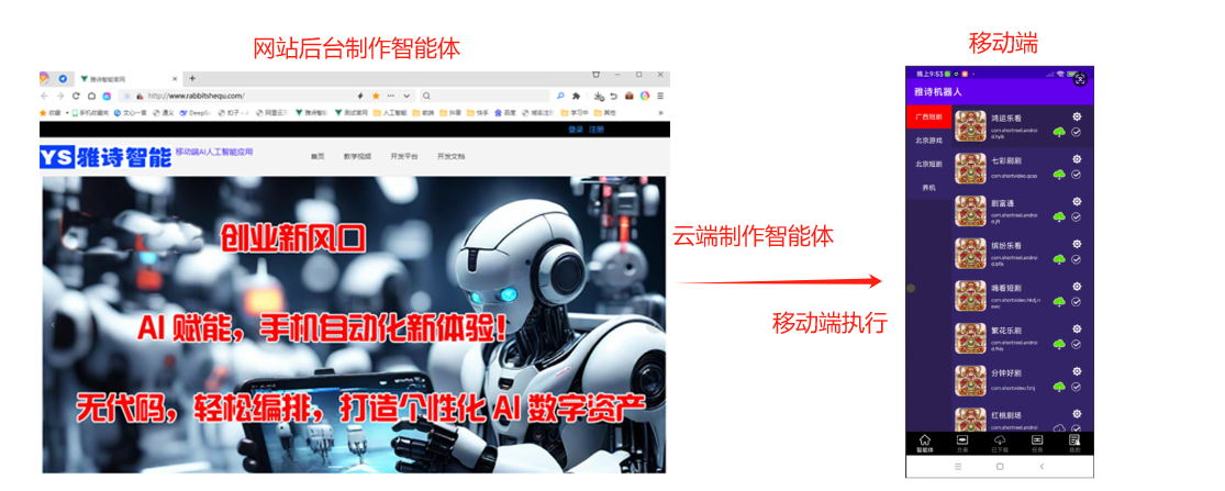 执行载体是“雅诗机器人”,通过可视化编排好的流程,把智能体装载到机器人上面,机器人通过AI视觉,象长了一对眼睛,可以识别手机上的图片,并执行相应的指令。登录开发者后台,根据需求开发自动化流程,流程分为两类,一类是并行流程,适合开发小游戏类自动化,另一类是串行流程,合适开发阅读类自动化。雅诗智能是Adnroid移动端,智能体开发平台,无需编写代码,可视化开发,简化了复杂的代码编程,学习门槛相对比较低