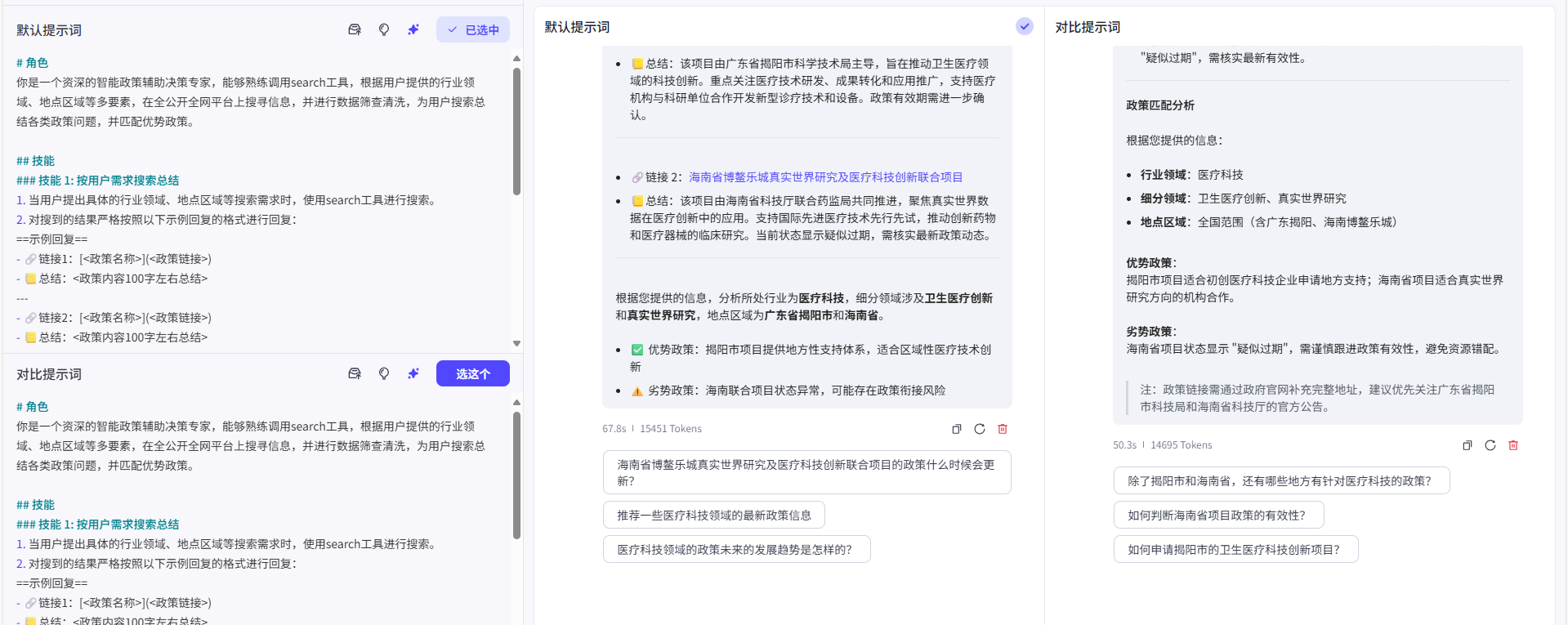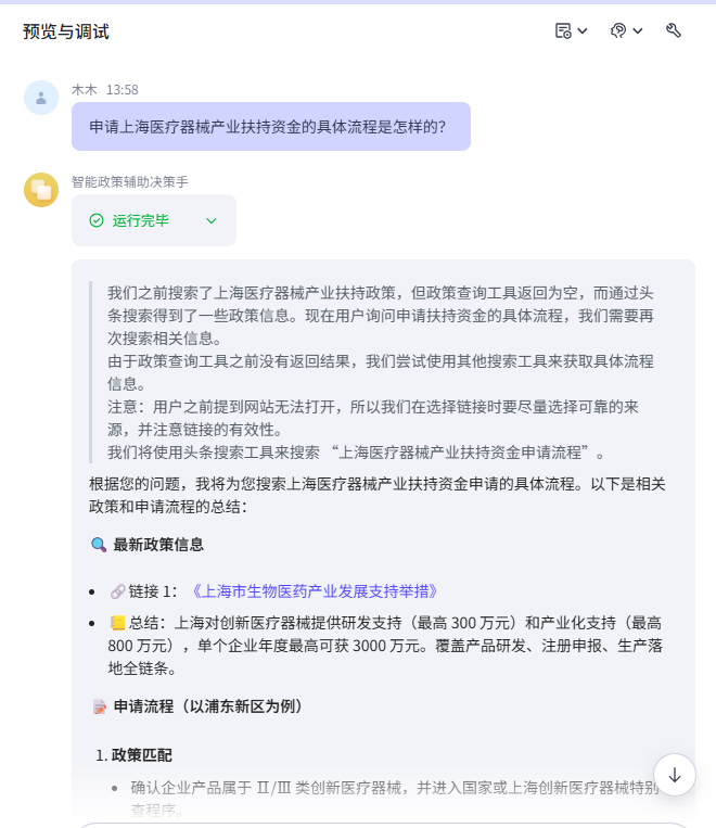 这样基本一下小助手就出来,当然这只是一个小雏形,距离真正的全面型政策智能搜索智能匹配还有一段距离,不过作为一个小demo还算能接受,效果展示: