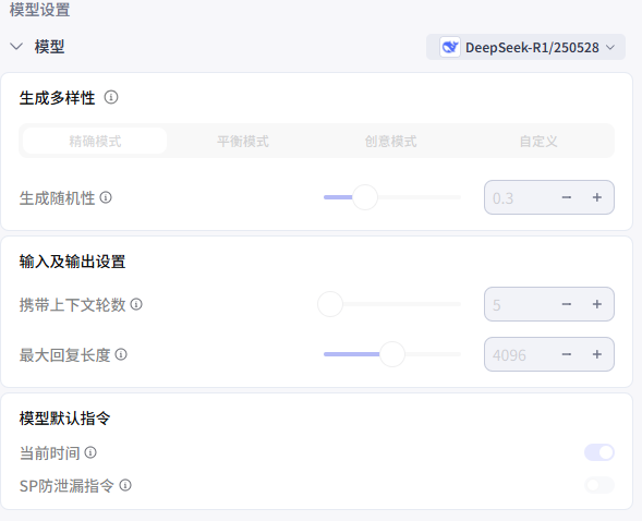 1.模型设置:选择你觉得合适的模型,这边我选用的是deepseekR1 0528的版本,我还是觉得很好用的。