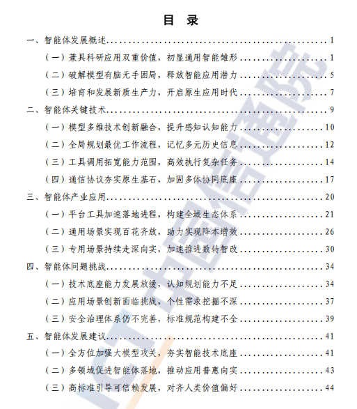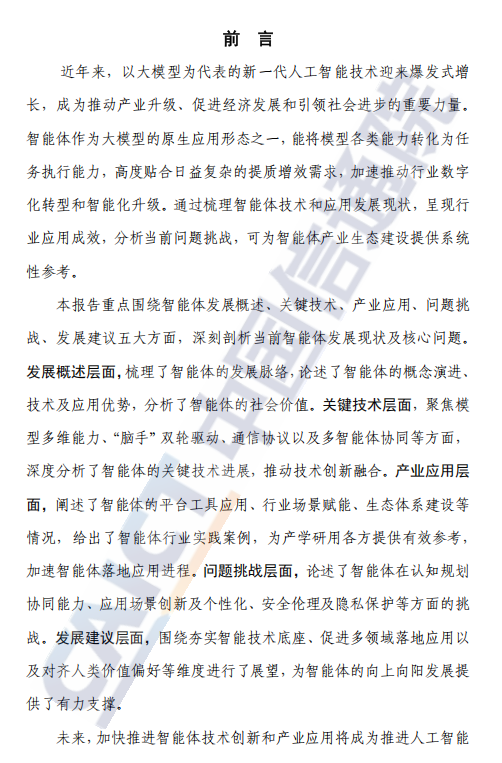 智能体技术作为新一代人工智能的核心应用形态,正加速推动行业数字化转型和智能化升级。本报告从发展概述、关键技术、产业应用、问题挑战和发展建议五个方面深入剖析智能体的现状与未来。