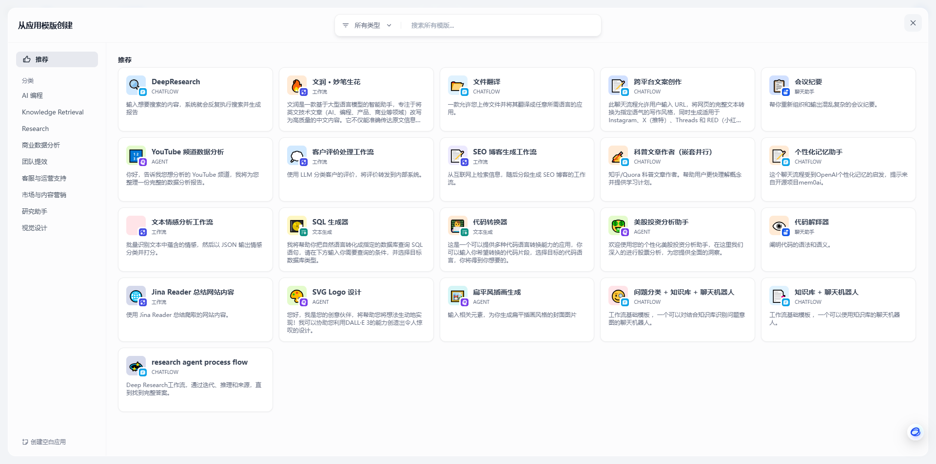 支持视觉创建工作流,能够将不同的组件连接成一个完整的应用,实现了复杂 AI 应用流程的编排和执行,提高了应用的开发效率和可维护性。