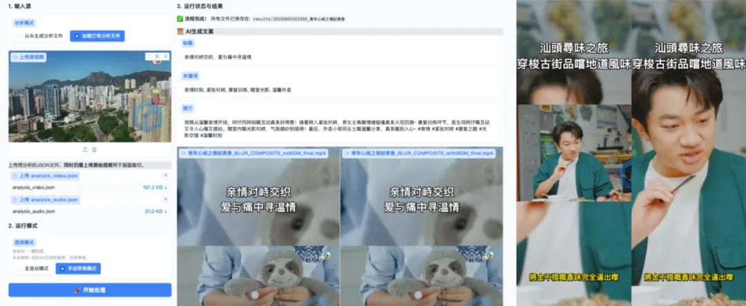 二等奖获奖成员谢志聪、郑锦辉,暨南大学人工智能专业硕士研究生,基于开源项目NarratoAI进行二次开发,深度重构其数据处理流程,引入基于文心4.5的多模态理解机制,融合字幕与关键帧信息,实现对视频剧情的更精准分析,并新增对粤语长视频剪辑及配音的全流程处理能力。