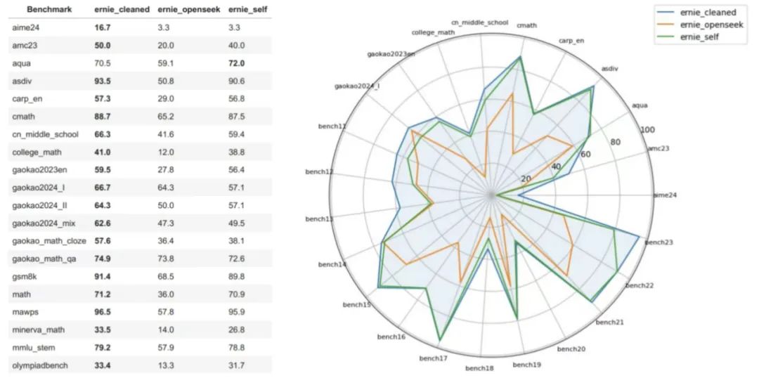 一等奖获奖选手蔡奇栩、范西莎、关浩轩,主要来自北京大学计算语言所与信息管理学院、北京航空航天大学,使用ERNIE-4.5基座模型,模块化控制每一步思维链数据的生成与验证,仅用14%高质量精选OpenSeek-Math数据微调ERNIE-4.5-21B-A3B,来带23个Math benchmark的性能提升,诠释了“数据质量远胜于数量”的核心理念。