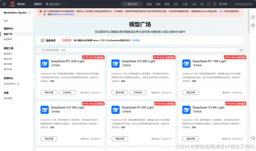 华为云控制台模型广场内可按需挑选所需要的大模型。