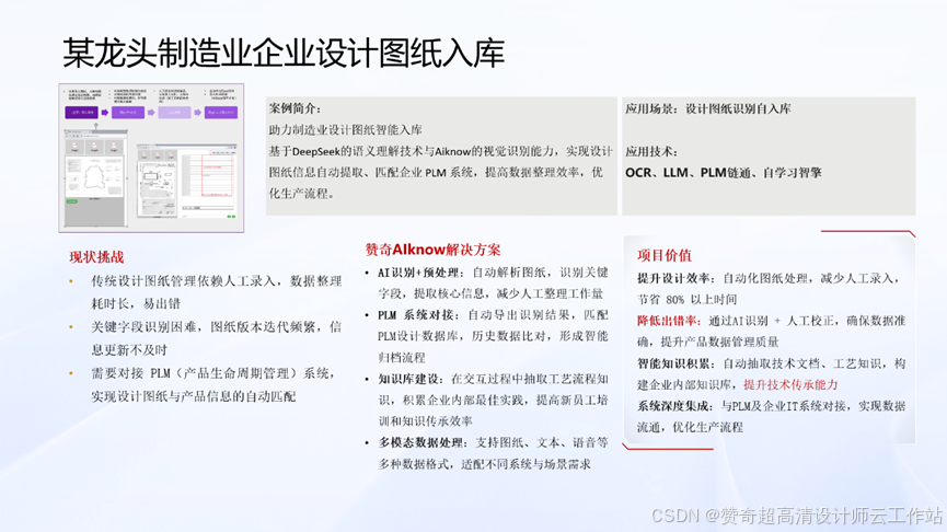 - 跨软件系统集成:企业可通过可视化界面快速集成ERP、PLM等系统接口,实时接入离散的数据源与内部系统API,解决数据孤岛问题。例如,制造业通过对接PLM系统,实现设计图纸通过AI自动化解析与入库,显著提升人工录入图纸信息的效率。