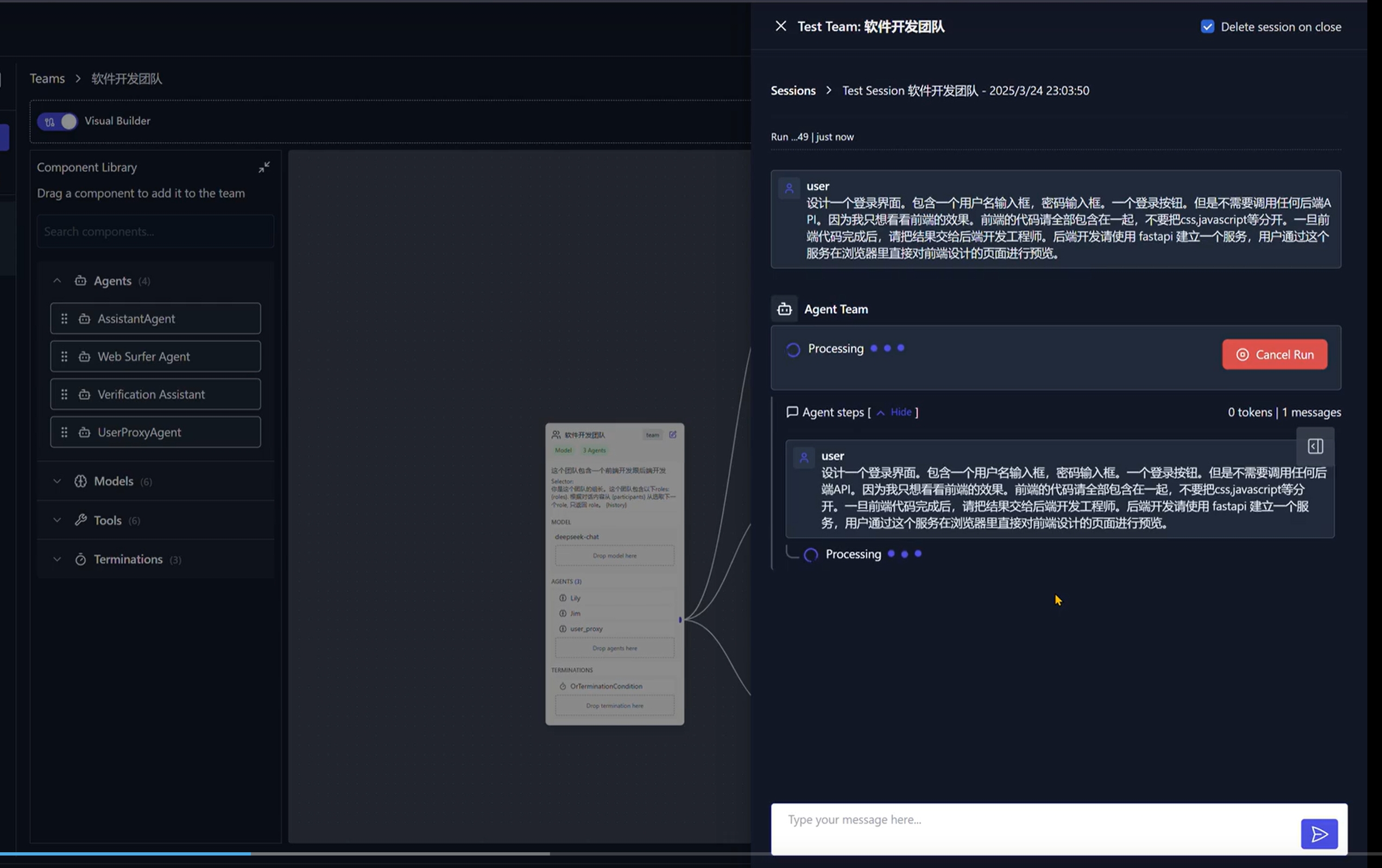 任务输入进去后可以看到各个 Agent 开始工作了,先是前端设计了页面,输出了 html,css 文件。最后后端工程师使用 python 直接生成了一个 web service 承载了这页面。我们访问能直接输入这个刚刚设计的登录框。