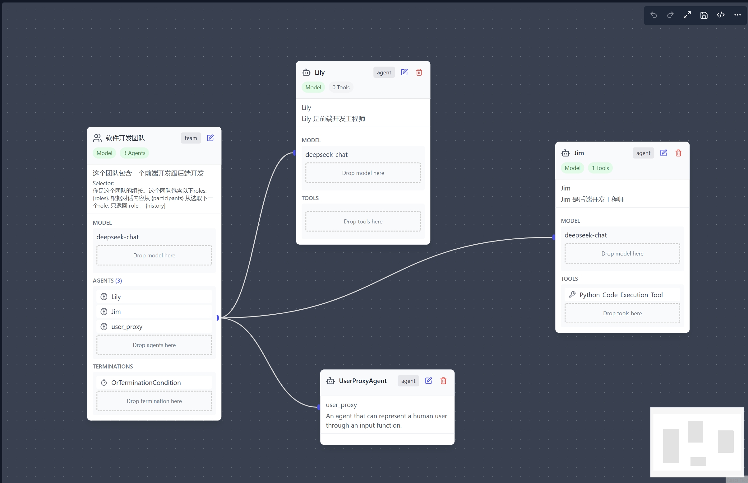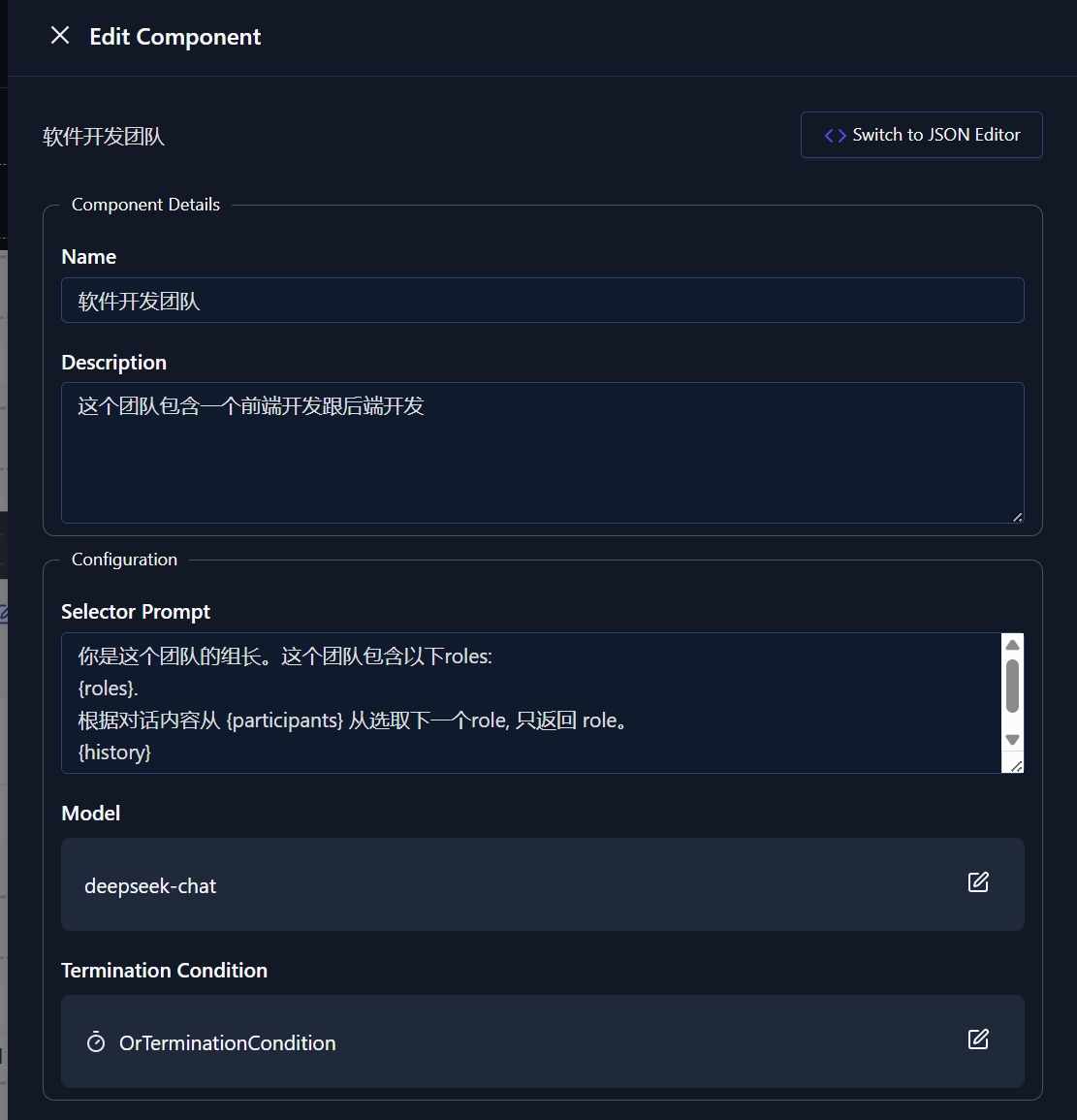 首先让我们在 AutoGenStudio 里面定义一个 team。定义的时候需要指定使用的模型,推出条件。以及 prompt。