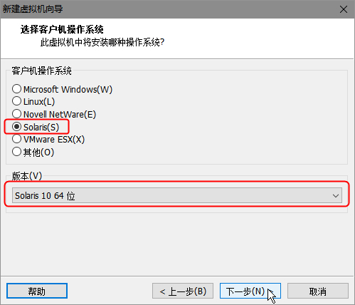 系统类型选择Solaris 10 64位。