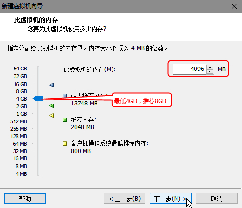 文档要求内存最低4GB,推荐8GB,这里选择4GB。