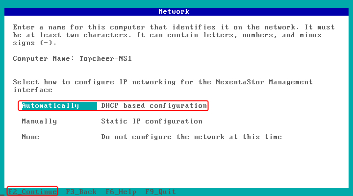 按Tab键选择Automatically DHCP,并按F2下一步