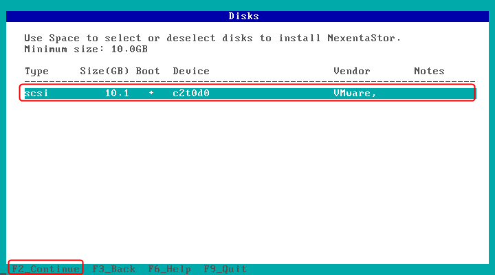 将从文章开始处下载链接下载的NexentaStor5.0.1.5.iso镜像文件挂载到我们刚新建的VM中,并开机引导ISO,开始安装NexentaStor 5.0