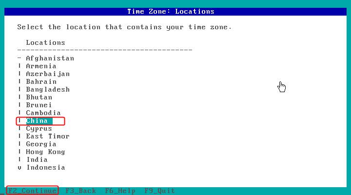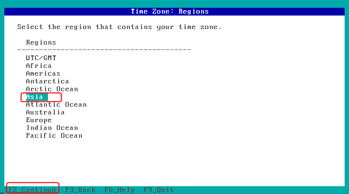 时区选择Asia,F2下一步