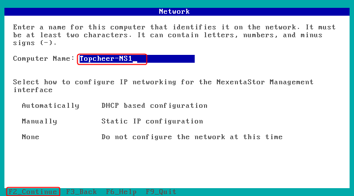 设置计算机名“Topcheer-NS1”,按Tab键选择Automatically DHCP