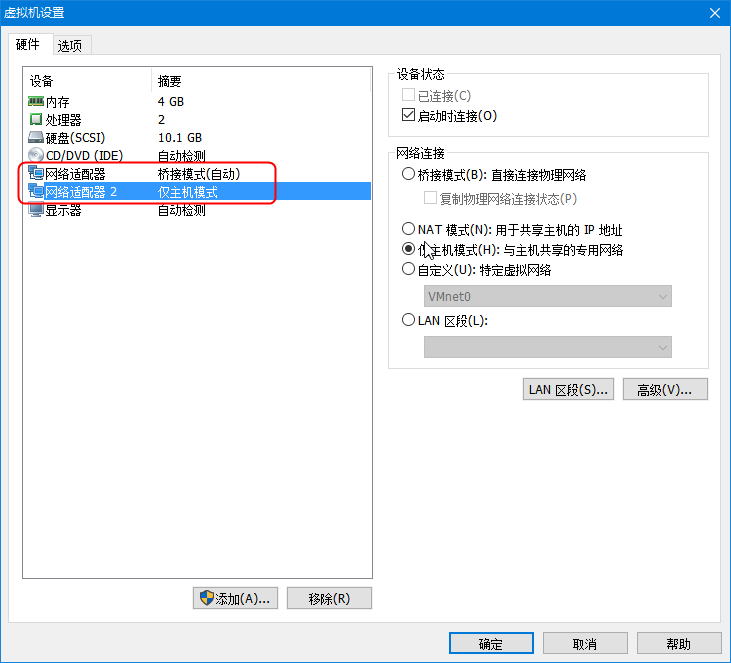 VM最终配置如下图,一号网卡为桥接,二号网卡为仅主机