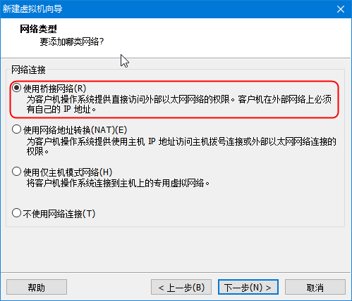 这里踩过坑,请务必保证PC机可以通过DHCP能够获取到网关DNS,并且此处务必选择桥接。