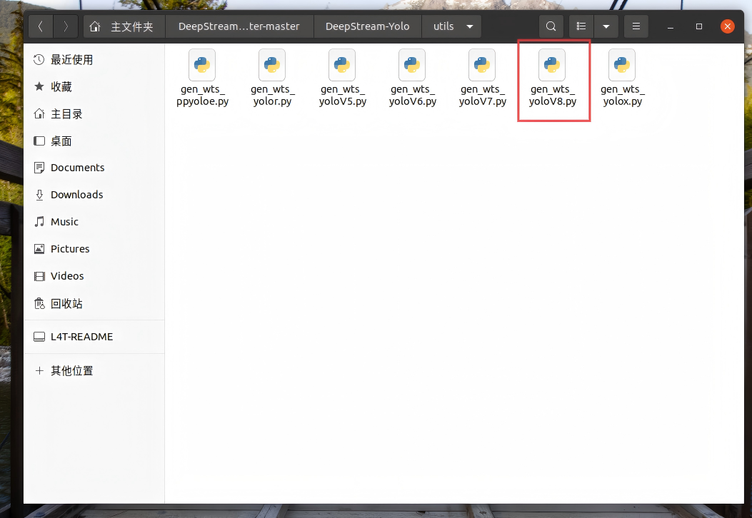 进入DeepStream-YOLO/utils中,将gen_wts_yolov8.py脚本复制到yolov8的文件夹中。运行该脚本,如下图所示: