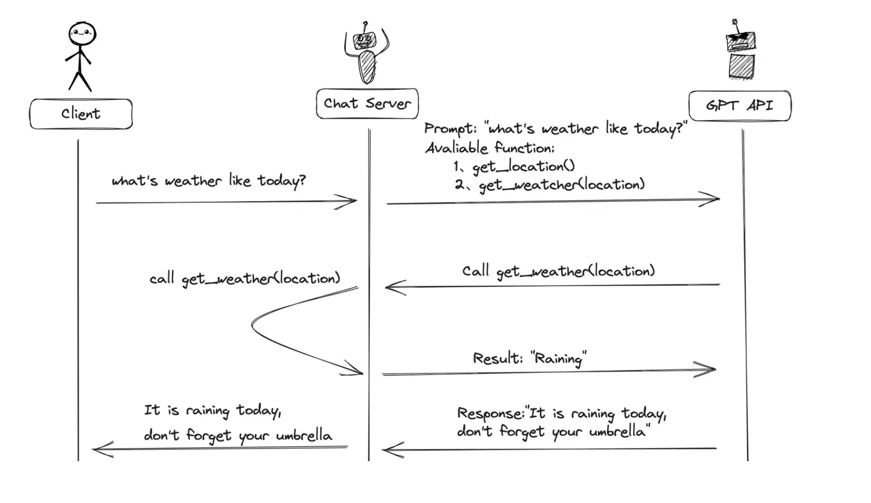 - 如果是函数调用格式,那么Chat Server就会执行这个函数,并且将结果返回给GPT